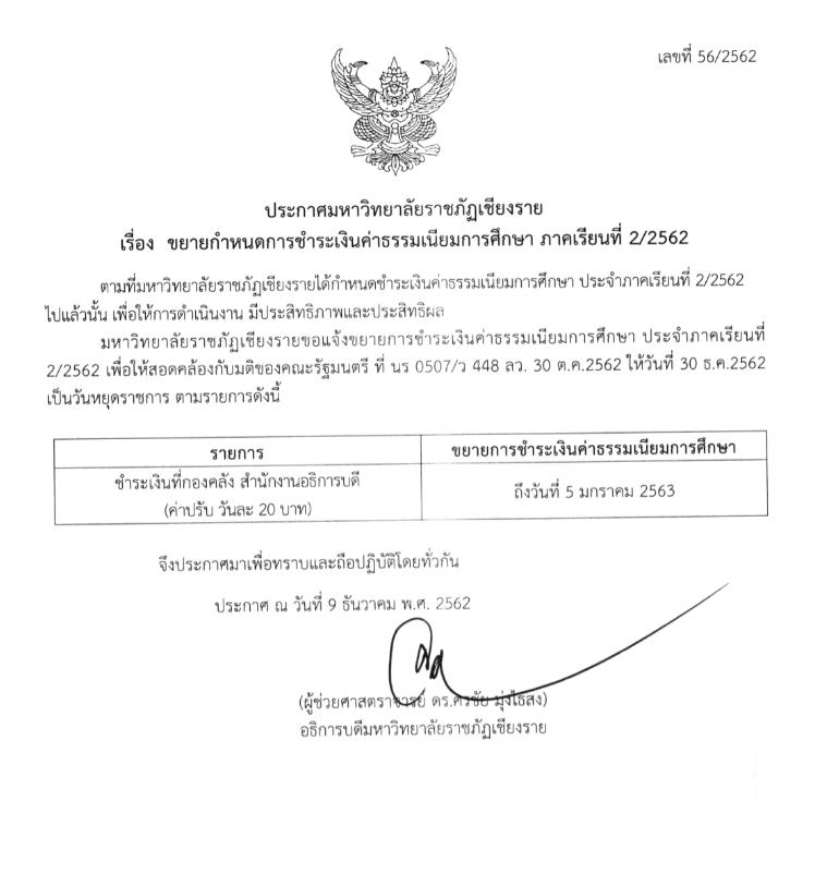ขยายประกาศกำหนดการชำระเงินภาคเรียนที่2/2562